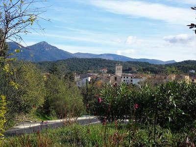 maisons blotties autour de l’ancien château féodal face à la plaine du Vallespir et la Méditerranée.