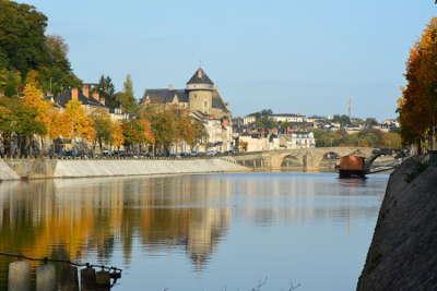 Poursuivre vers Mayenne, via le boulevard Jean Monnet (75 km). La ville fait partie du Pays d'art et d'histoire Coëvrons-Mayenne. Mayenne conserve de son passé d'ancienne place forte et de cité ducale, un imposant château, dont la silhouette domine depuis plus de mille ans le cours d'eau de la Mayenne. Successivement palais carolingien, château fort et prison.