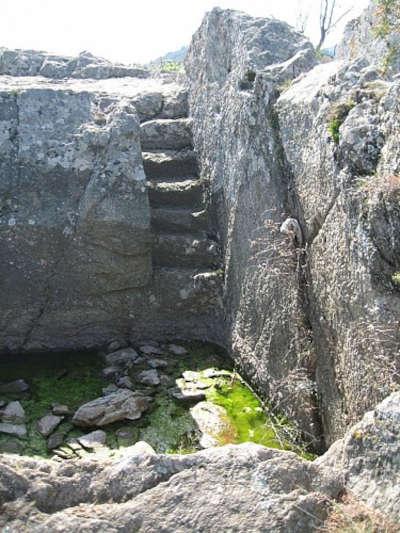 Le fossé est entièrement taillé dans le rocher atteignant par endroits 8 m de profondeur, remarquables par leur ampleur et la finesse de sa construction. Cet aménagement remplissait la fonction d’une réserve d’eau. En effet, aucune source permanente n’alimentait le site. Au niveau du fossé, un système de récupération d’eau a été aménagé avec, au sud, un large couloir très pentu permettant de récupérer l’eau de ruissellement et de remplir un premier bassin fermé par un barrage taillé dans la roche. Celui-ci alimente un second bassin de stockage.